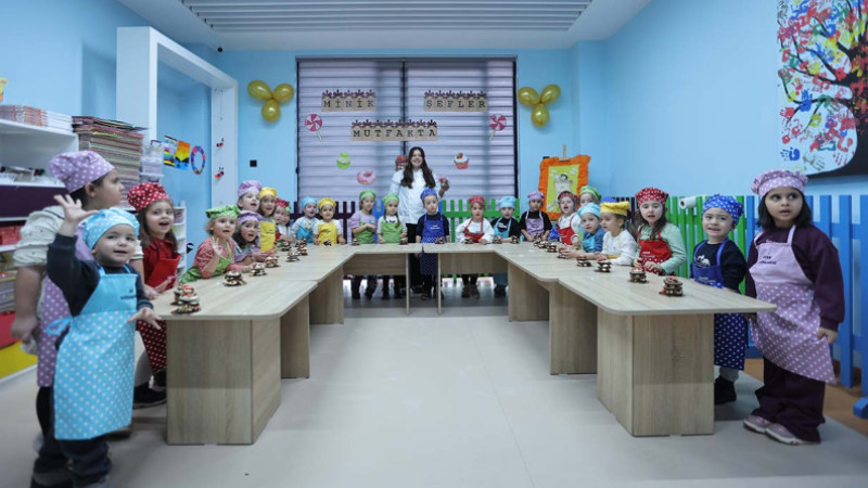 Şef kıyafetlerini giyerek eğlence dolu etkinliğe katılan miniklerin heyecanı ve mutluluğu gözlerinden okundu.